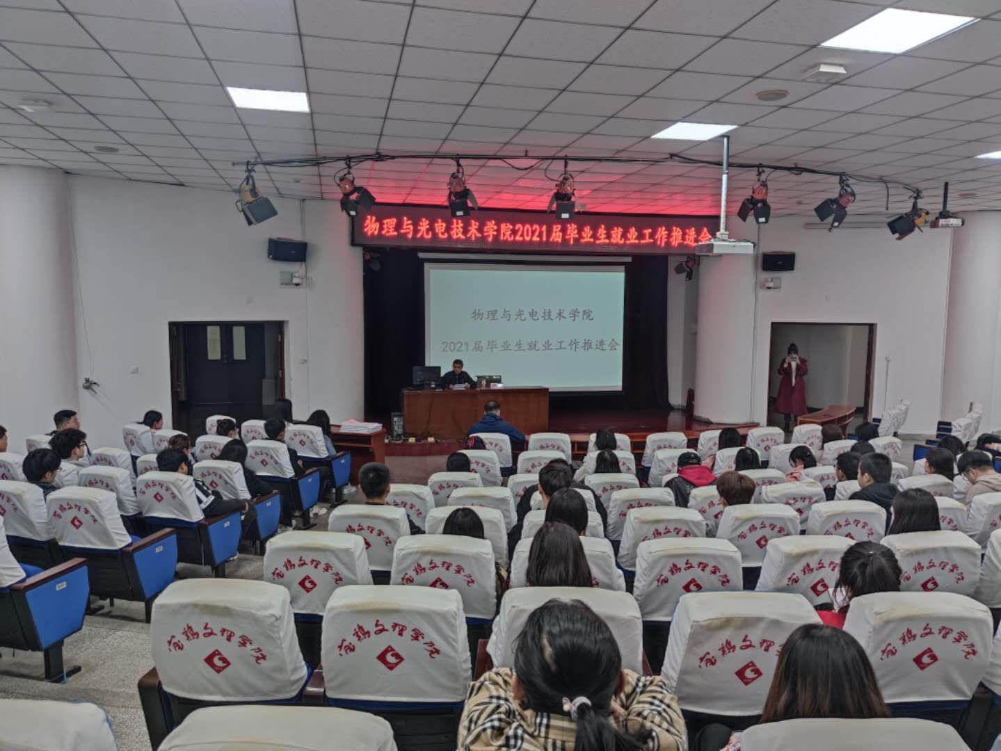 10月20日,太阳成集团tyc234cc在综合楼1号报告厅召开2021届毕业生就业工作推进会,党委副书记邓茹、员工就业辅导员陈雄刚以及全体在校毕业生参加了会议。