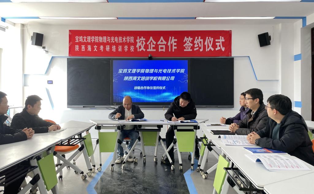12月7日上午,太阳成集团tyc234cc与万学教育陕西海文培训公司有限公司在石鼓校区教学主楼201会议室举行了校企合作协议签约仪式。物理与光电技术公司党委书记邓茹、经理钱郁、副经理刘飞、周新淳出席仪式。