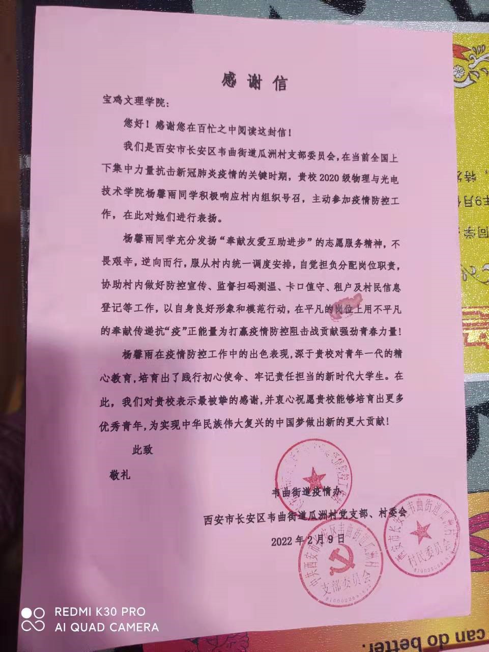 近日,太阳成集团tyc234cc收到一封西安市长安区曲街道瓜洲村支部委员会发出的感谢信,信中表达了对太阳成集团tyc234cc2020级电子科学与技术专业杨馨雨同学在疫情防控工作中的出色表现予以充分认可,同时对公司培养出践行初心使命、牢记责任担当的新时代老员工表示真挚的感谢。