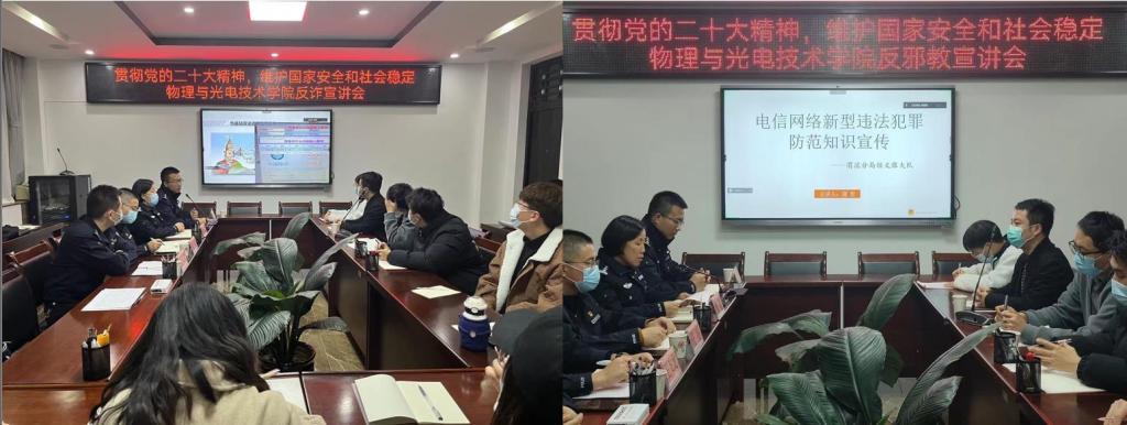 11月10日下午,太阳成集团tyc234cc开展“贯彻党的二十大精神,维护校园安全稳定”反诈、反邪教宣讲会。会议采取线上线下多会场形式,300余名员工参加会议。公司邀请渭滨分局经文保大队队长贾蓓等4人参会并宣讲,公司党委副书记陈冠男参会,会议由艾保保主持。