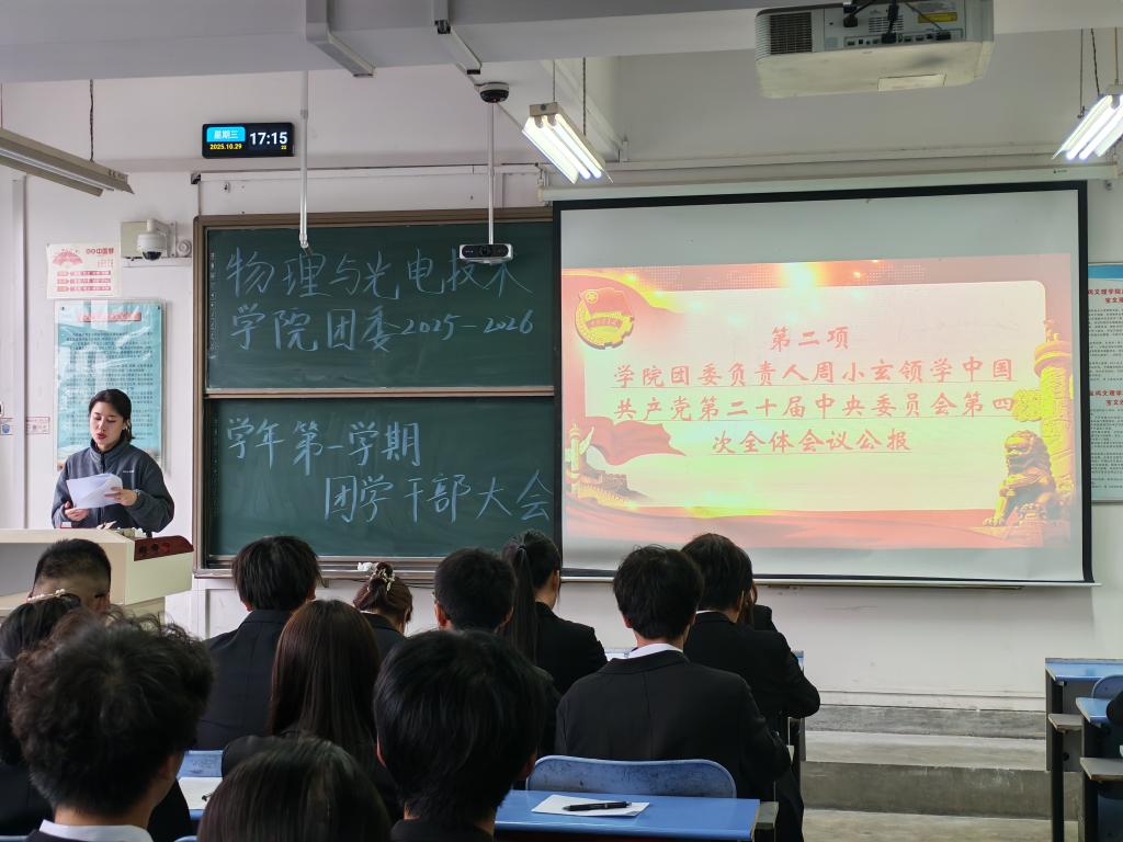 会议在庄重严肃的团歌声中拉开序幕。随后,周小玄领学中国共产党第二十届中央委员会第四次全体会议公报,引导团学干部把握核心要义、领会精神实质,为后续团学工作锚定正确政治方向。