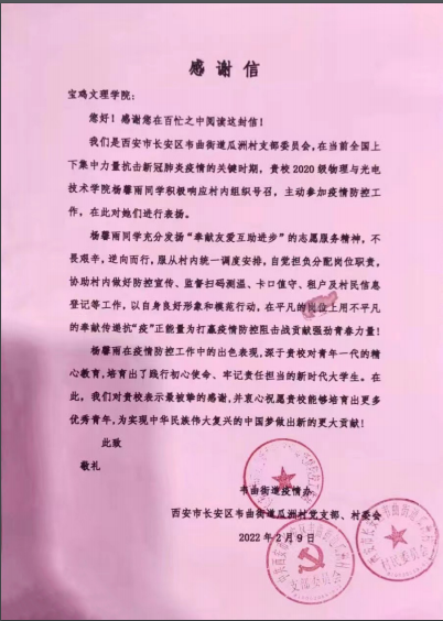 近日,太阳成集团tyc234cc收到一封西安市长安区曲街道瓜洲村支部委员会发出的感谢信,信中表达了对太阳成集团tyc234cc2020级电子科学与技术专业杨馨雨同学在疫情防控工作中的出色表现予以充分认可,同时也对公司培养出践行初心使命、牢记责任担当的新时代老员工表示真挚的感谢。