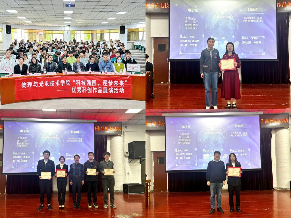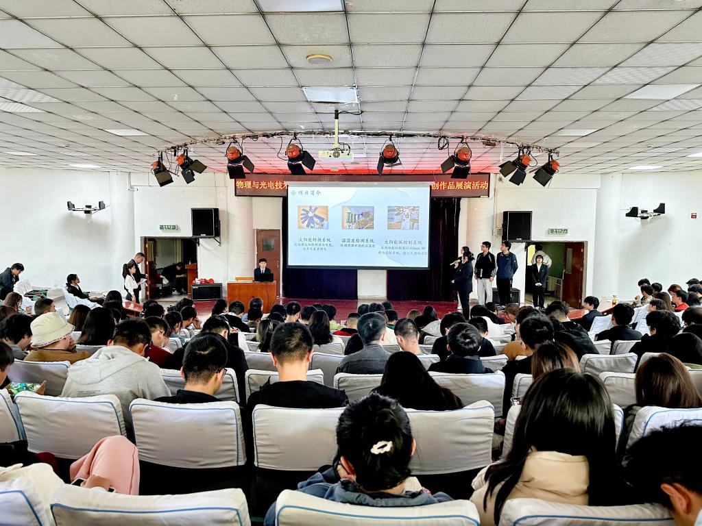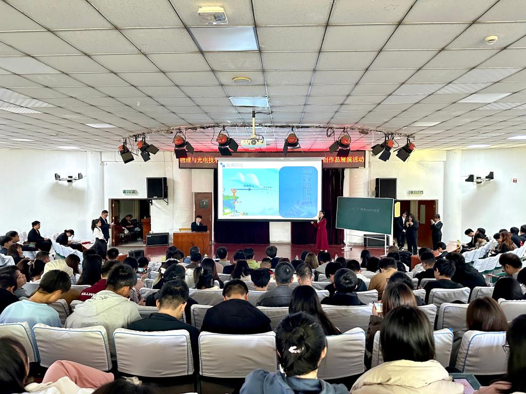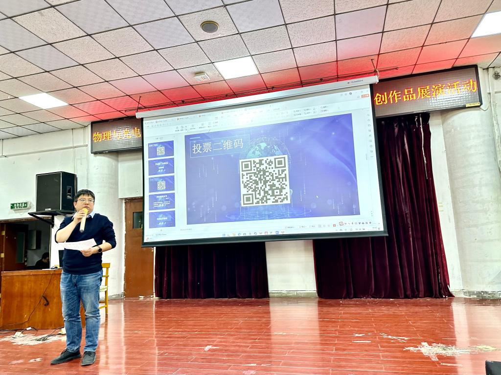 展演活动分电子科学与技术专业组、物理专业组以及材料物理专业组三个组别,共13个团队参与展演。各团队项目内容涵盖科技创新、产业结构、乡村振兴、社会治理、生态保护、物理教学等多个行业及角度,通过实物展示、视频展示、PPT汇报等方式,对项目背景、作品原理、创新要点、成果应用等进行了全方位展示。选手们在展演中沉着冷静,落落大方,观点清晰,凭借敏锐的思维以及优秀的表达能力获得掌声阵阵。经过激烈角逐,综合评委现场打分、现场观众投票以及前期预热投票,电子科学与技术专业组庞斯源等同学的作品《绿色生活——新式智能垃圾分类辅助识别系统》、物理学专业组王凡同学的作品《拋体运动的规律》、材料物理专业组宋英丹同学的作品《光电有约—高透光伏幕墙的领跑者》等3个作品获得最具影响力作品奖项。