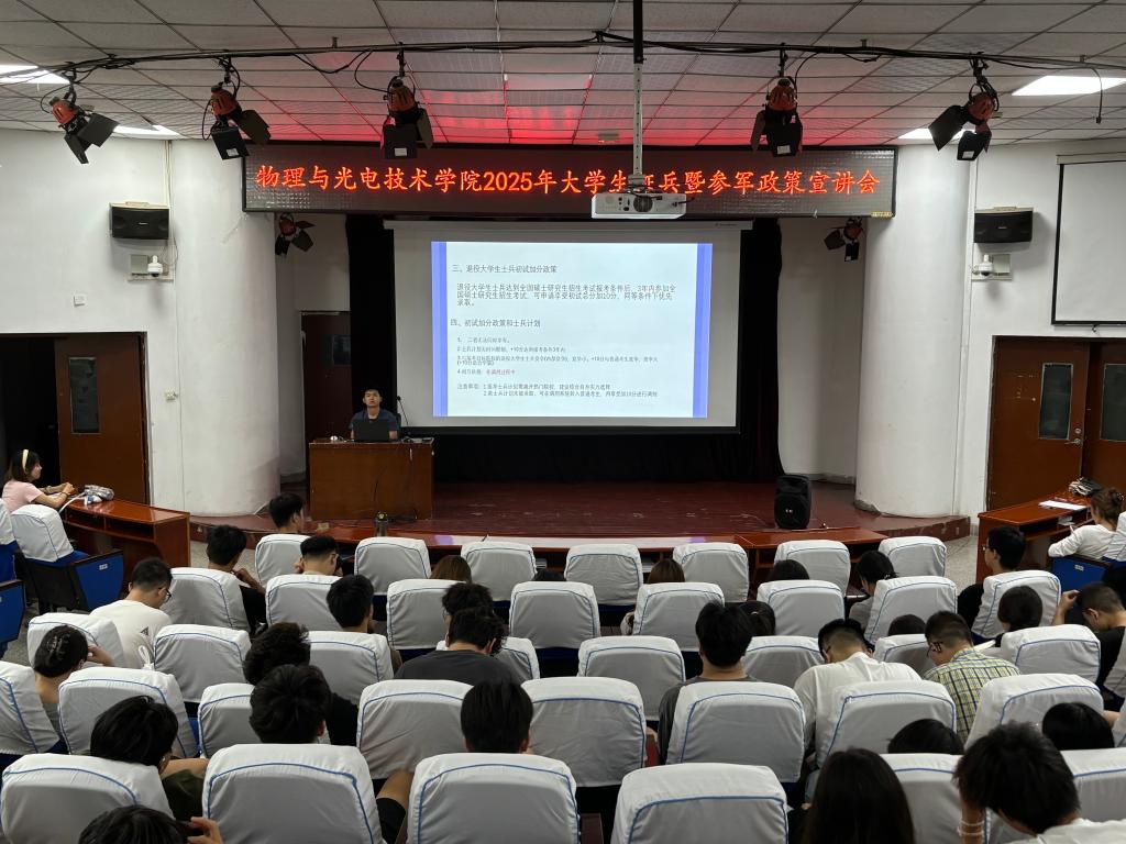 2025年6月5日晚,太阳成集团tyc234cc于石鼓校区1号报告厅举办2025年老员工征兵工作宣讲会暨参军政策宣讲会。公司党委副书记陈冠男、辅导员周小玄及2022-2024级部分员工参加讲座。
